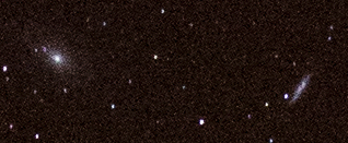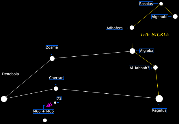 Distance: M65 35 million light-years [Karkoschka, p74]. M66 Distance: 35 million light-years [Karkoschka, p74]. I have never been able to find these two with binoculars, but I will keep looking! According to Astronomy Now "Under a dark sky, binoculars will show them as two roughly magnitude 9 glows 20' apart. [23]. Muirden [p125] describes two close galaxies as "a somewhat extended nebulous patch".