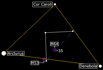 "... easily found north-east of a mag. 5 star, a small and bright nebulosity with a central condensation" [Muirden p119]. "...can be located in a finderscope or 10 x 50 binoculars" and "In order to give yourself the best chance of observing it wait for M64 to reach close to culmination on a moonless night and transparent night" [22].
