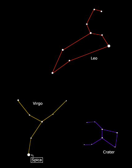 Distance: 250 light-years [Karkoschka p86]. Spica can be found by continuing the (curved) line from Ursa Major's tail through Arcturus [Moore, Stargazing p62]. Spica is a "spectroscopic" binary made up of two blue dwarf stars [25]. These orbit each other in only 4 days, at a distance of around twenty-eight solar-radii. This puts them so close together that their mutual gravity tidally distorts their atmospheres, with the result that the stars are not spherical [24]. Winds from both stars collide violently producing large amounts of x-ray light [25].