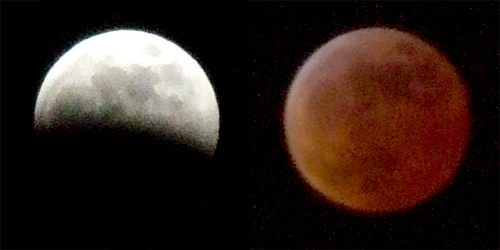 3.21 am - The moon appears totally immersed. There is a yellow sliver at the south east limb. The bulk of the moon is orange.