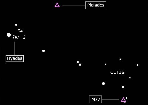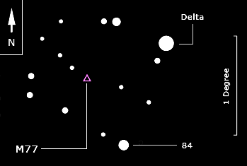 In the very early hours of the 21st November 2006 I found M77 using 12x42 glasses, the galaxy looked exactly like just another small star, very dim, only visible with averted vision. The experience prompted me to prepare the star chart below: