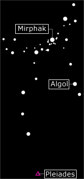 Distance: 500 light-years [Karkoschka p28]. A young white/yellow supergiant [16] which used to be a hot blue star but because of its high mass [18] "is evolving toward cooler temperatures with a dead helium core" [17]. Mirphak is the brighest member of the Alpha Persei Cluster [18].